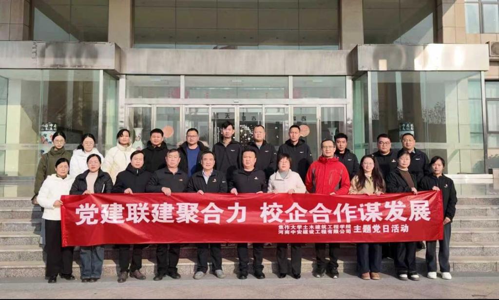 为深入贯彻落实党建引领产教融合发展理念,进一步深化校企合作、实现资源共享与优势互补,12月11日上午9点,焦作大学土木建筑工程学院党总支书记刘文莉、院长李志阳带领学院领导班子成员、教研室主任、实验室主任及党员代表一行,赴河南中安建设工程有限公司开展校企联建党支部主题党日活动。河南中安建设工程有限公司董事长张兆新,党总支书记、总经理杨小明,党总支副书记、副总经理、工会主席梁保国,总助、支委杨阳阳,支委、机关书记康伟,支委、九处书记梁艳红及企业其他党员、积极分子代表热情接待并参与活动。