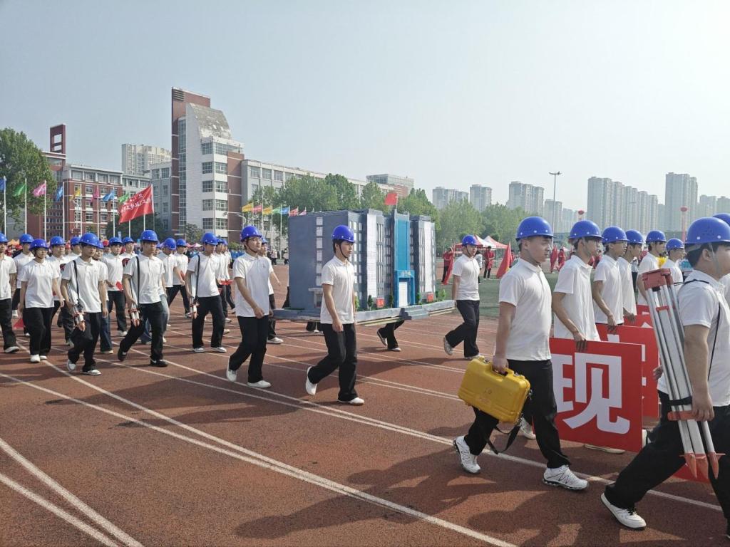 在激昂的运动员进行曲中,土木建筑工程学院方阵迈着整齐有力的步伐步入会场。同学们精神抖擞、口号嘹亮,抬着由学生亲手精雕细琢的教学楼模型,模型结构精巧、细节逼真,生动诠释了土木学子“匠心筑梦”的专业追求与脚踏实地、向上向善的精神风貌,赢得全场热烈掌声。